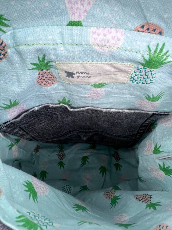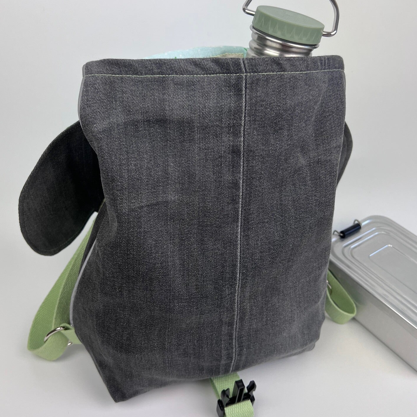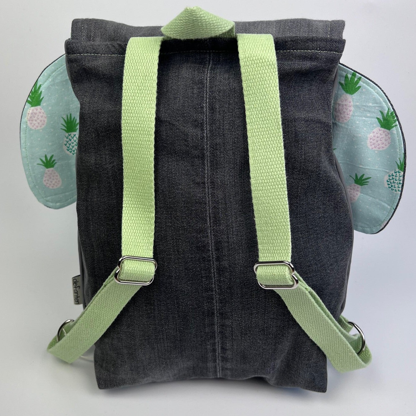 Kinderrucksack aus einer grauen Jeans mit Innentasche und verstellbaren Gurten und einem hellblauen Ananas Futter.